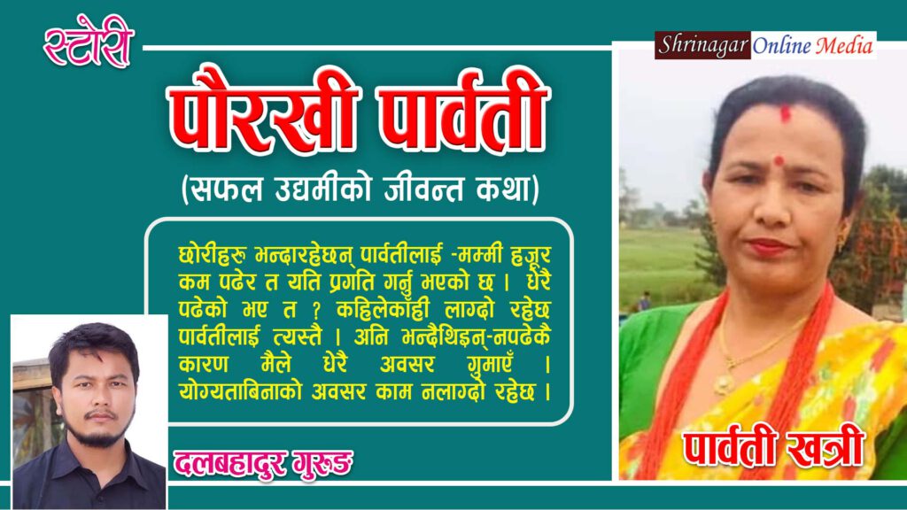 उमेर १४ वर्ष पढाई सात कक्षा । विहे हुँदाको विवरण हो पार्वती खत्रीको । त्यो कुरा २०४३ को हो । श्रीमान् रामबहादुर खत्री नेपाल प्रहरीमा जागिरे । विहेपछि दुईवर्षसम्म पढिन् । उनका माइती यतै बुटवल बस्थे । सोही कारण बुटवलको कान्ति माविमा पढेकी थिइन् उनले । कक्षा नौंसम्म पढेकी पार्वतीको औपचारिक पढाई कम भएपनि व्यवसायिक पढाई भने कुनै डिग्री होल्डरको तुलनामा कम छैन । विहेपछि श्रीमानले पढ्न कर गरेकै थिए तर उनलाई खोइ ! किन जाँगर चलेन ।